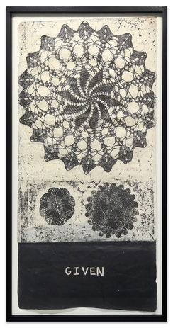 (detail) Kiki Smith Given, 1994 Unique collage using relief monotype attached to lithograph with cut-out letters, all on handmade Nepalese paper Paper size: 38 1/4 x 19 3/4 inches (97.2 x 50.2 cm) Frame size: 41 1/2 x 22 3/4 inches (105.4 x 57.8 cm) Signed and dated lower right (Inventory #36136)